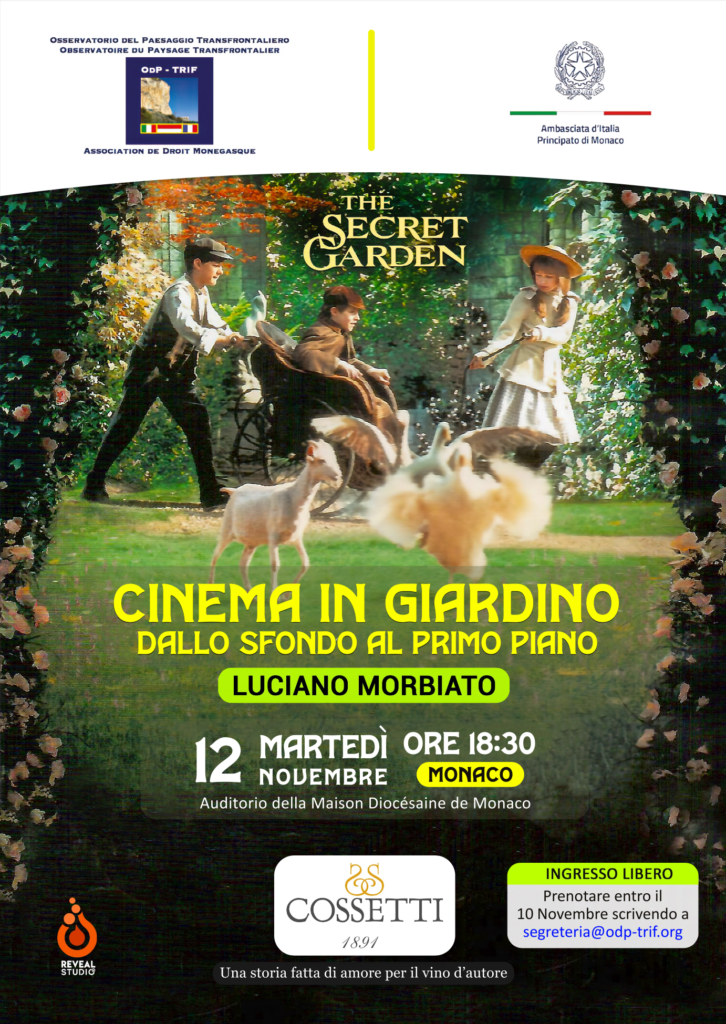 PROGRAMMA dell’incontro di martedì 12 novembre 2024, alle ore 18:30 all’Auditorium dell’AGORA, Maison Diocésaine de Monaco, 18 Rue Bellevue, per la conferenza “CINEMA IN GIARDINO – Dallo sfondo al Primo Piano”, un percorso tra i Giardini nel Cinema, di Luciano MORBIATO, PhD in Scienze Letterarie, già Docente all’Università di Padova e Relatore al GRUPPO GIARDINO STORICO dell’Università di Padova.