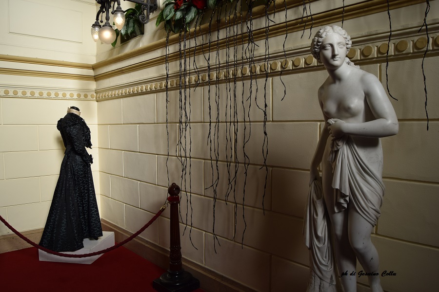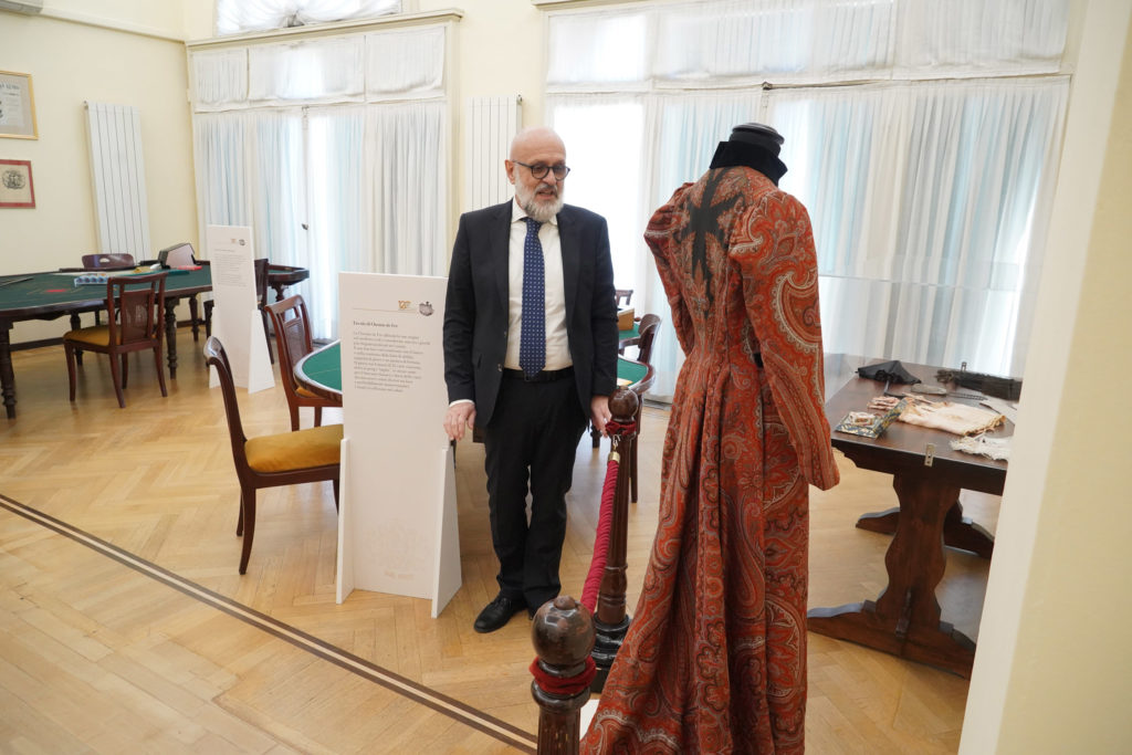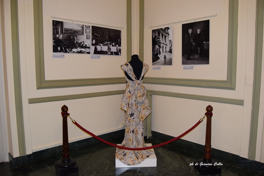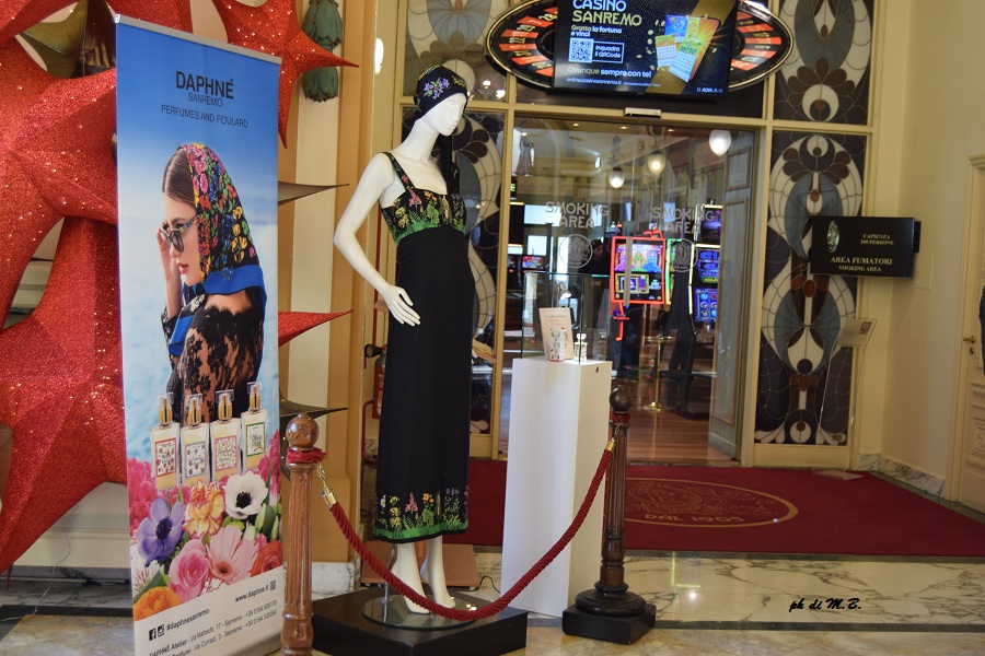 L’eleganza dell’esposizione viene accentuata dagli splendidi abiti d’epoca che raccontano l’evoluzione della moda da fine ‘800 ad oggi. Due abiti da ricevimento sono posti sulla scalinata che porta alle sale superiori, un elegante abito fatto con scialle del cashmere e una serie di accessori femminili scaldano l’ambiente tra i tavoli da gioco per poi arrivare nel foyer, dove rivivrete le atmosfere della Belle Époque con gli iconici “abiti Riviera” in cotone e pizzo: un elegante abito da sera anni ‘30 in seta per ricordare il primo Gala della Moda del 1937 svoltosi al Casinò. Infine un iconico abito da sera fine anni ‘60 per ricordare il “Festival della Moda Italiana” che hanno consacrato il Made in Italy e in quegli anni hanno reso celebre la Riviera. Il percorso della moda in 120 anni si conclude con una creazione moderna della collezione “Fiori di Montagna” in tessuto sostenibile, realizzato, dell’Atelier DAPHNÉ, e ispirato da un disegno d’archivio creato negli anni 80 da Renzo Borsotto in cui è protagonista la flora montana delle alpi liguri. Gli abiti d’epoca provengono dalla collezione del Museo DAPHNÉ della Moda e del Profumo di Sanremo, gentilmente concessi dalla famiglia Borsotto.