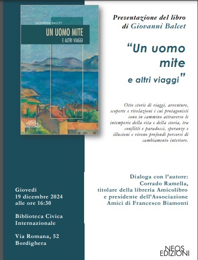 A dicembre raddoppiano gli incontri con l’autore alla Biblioteca Civica Internazionale di Bordighera: giovedì 19 dicembre alle 16.30 Giovanni Balcet presenterà “Un uomo mite e altri viaggi” (Neos Edizioni) nel corso di una conversazione con Corrado Ramella.