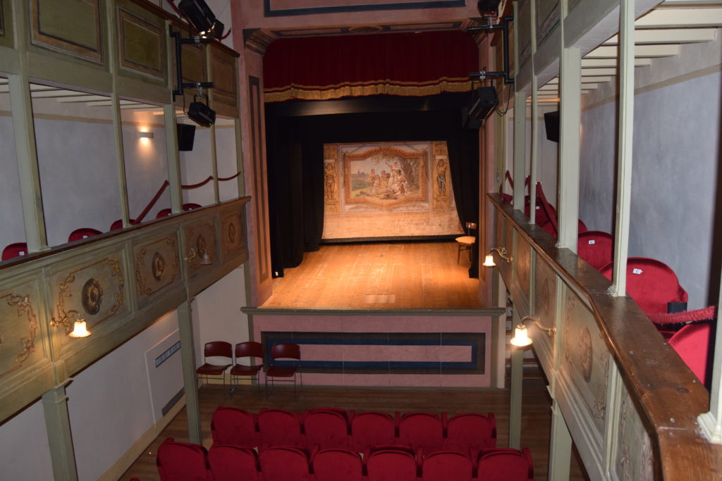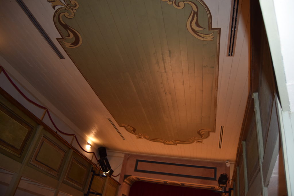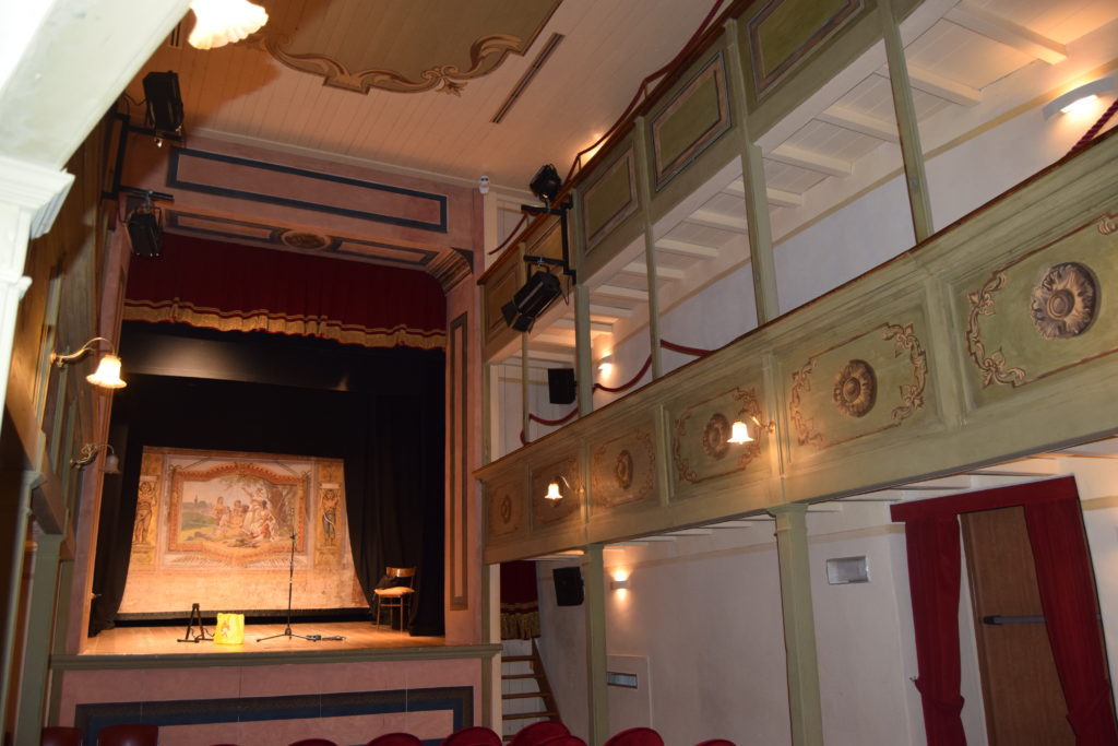 Da ricordare che tutta la struttura della sala, la sua copertura, il palcoscenico sono interamente in legno.