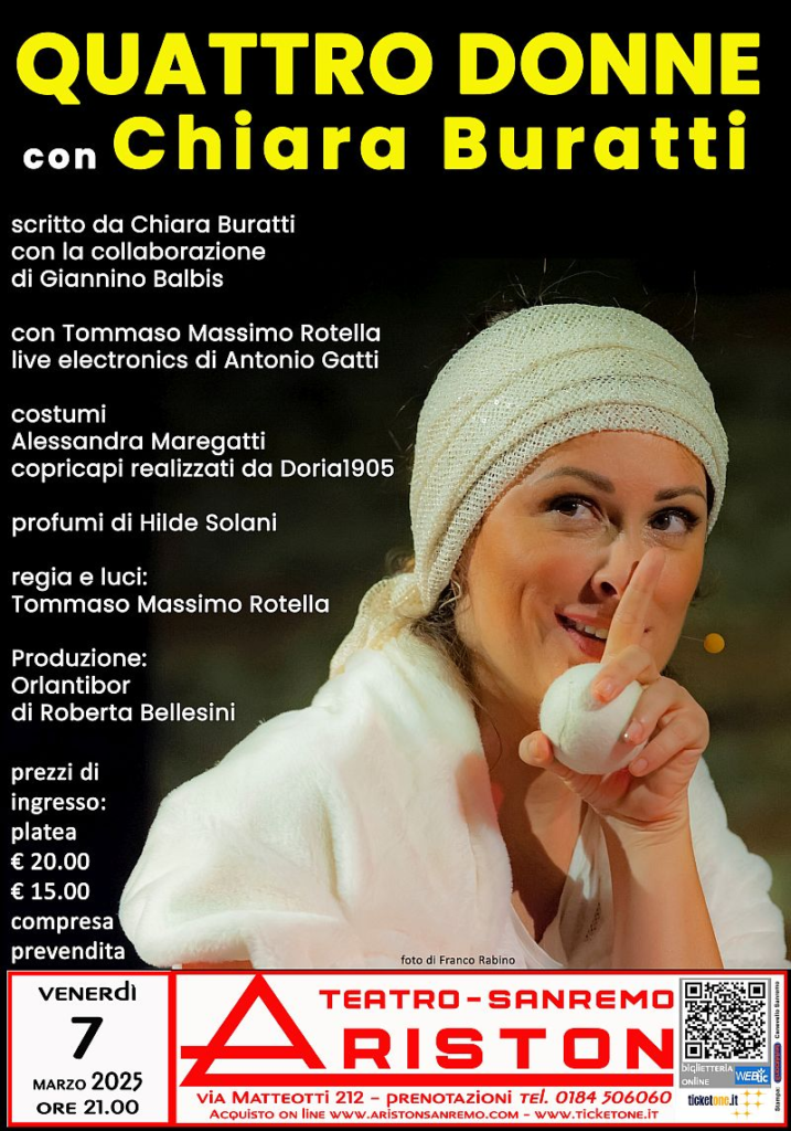 Ringraziamo la gentile attrice Chiara Buratti che ha cortesemente risposto alle nostre domande di presentazione relative allo spettacolo ” QUATTRE DONNE” che la vedrà in scena sul palco del prestigioso Teatro Ariston di Sanremo nella serata del 7 Marzo 2025 ore 21, alla Vigilia della “Giornata Internazionale dei Diritti delle Donne“.