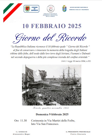 Il Comune di Sanremo aderisce alle celebrazioni per il “Giorno del Ricordo” con una cerimonia in via Martiri delle Foibe (lato via San Francesco) domenica 9 febbraio (ore 11.30), realizzata in collaborazione con il Comitato Provinciale di Imperia dell’Associazione Nazionale Venezia Giulia e Dalmazia.