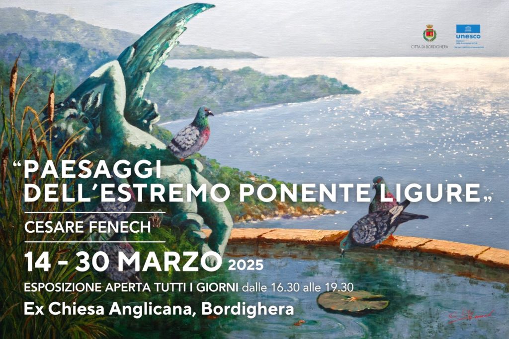 Venerdì 14 marzo alle 16.30, presso l’ex Chiesa Anglicana di Bordighera, un nuovo appuntamento con l’arte: verrà inaugurata la mostra di Cesare Fenech “Paesaggi dell’estremo Ponente Ligure”. La personale, organizzata dal Club per l’Unesco di Sanremo ODV in collaborazione con il Comune di Bordighera, proseguirà poi fino al 30 marzo, tutti i giorni dalle 16.30 alle 19.30.
