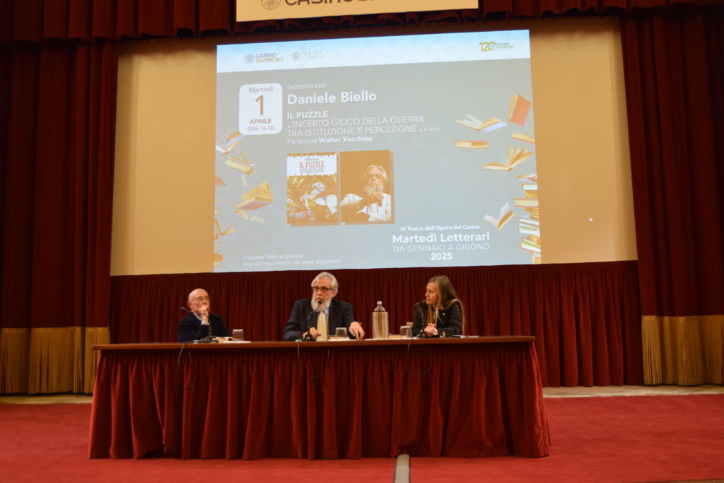 Martedì 1° aprile alle ore 16.30 nell’ambito dei Martedì Letterari, curati da Marzia Taruffi, nel teatro dell’Opera del Casinò di Sanremo, Daniele Biello ha presentato il saggio: ”Il Puzzle L’incerto gioco della guerra tra istituzione e percezione” (La Vela). All’evento ha partecipato Walter Vacchino.