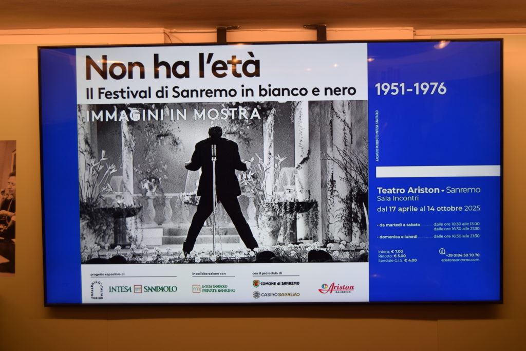 Oggi giovedì 17 aprile 2025 la mostra “Non ha l’età” Il Festival di Sanremo in bianco e nero 1951-1976″ realizzata dalle Gallerie d’Italia di Torino, è approdata a Sanremo al Teatro Ariston, dove resterà aperta sino al 14 ottobre 2025. La mostra è stata curata dal critico televisivo Aldo Grasso, in esposizione ci sono 85 fotografie provenienti dall’Archivio Publifoto Intesa Sanpaolo sulle edizioni del Festival tra il 1951 e il 1976, ultimo anno in cui la kermesse si svolse al Casinò di Sanremo per poi trasferirsi al Teatro Ariston nel 1977, che fu trasmessa per la prima volta a colori in televisione. Le fotografie in mostra hanno come soggetto principale i “fuori scena”: l’attesa dei cantanti in platea durante le prove; le passerelle degli artisti in giro per la città; la produzione degli autografi; il pubblico , gli artisti in sala trucco, l’orchestra, la giuria, la sala stampa. Un album di fotografie da ammirare , che ritraggono gli artisti lontano dai riflettori, nei momenti delle frenetiche giornate del Festival.