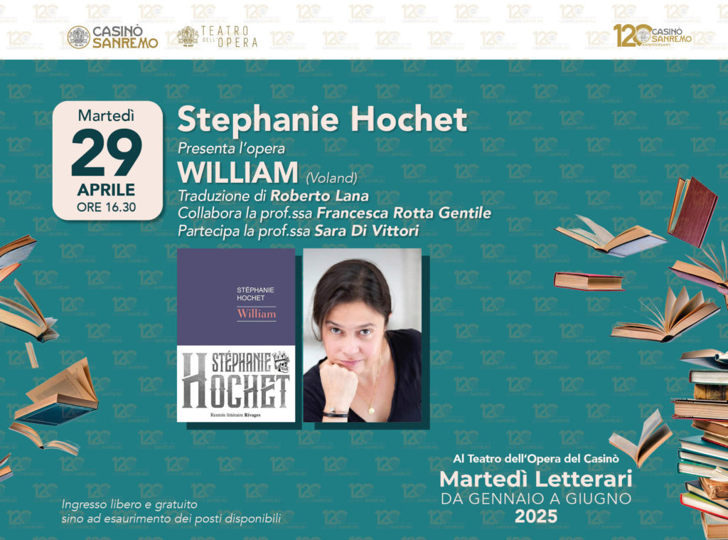 Martedì 29 aprile ore 16.30 nell’ambito dei Martedì Letterari del Casinò di Sanremo, curati da Marzia Taruffi, la scrittrice Stephanie Hochet presenta l’opera: “William” (Voland) Traduzione di Roberto Lana. Collabora la prof.ssa Francesca Rotta Gentile. Partecipa la prof.ssa Sara Di Vittori. Ingresso libero sino ad esaurimento dei posti disponibili.