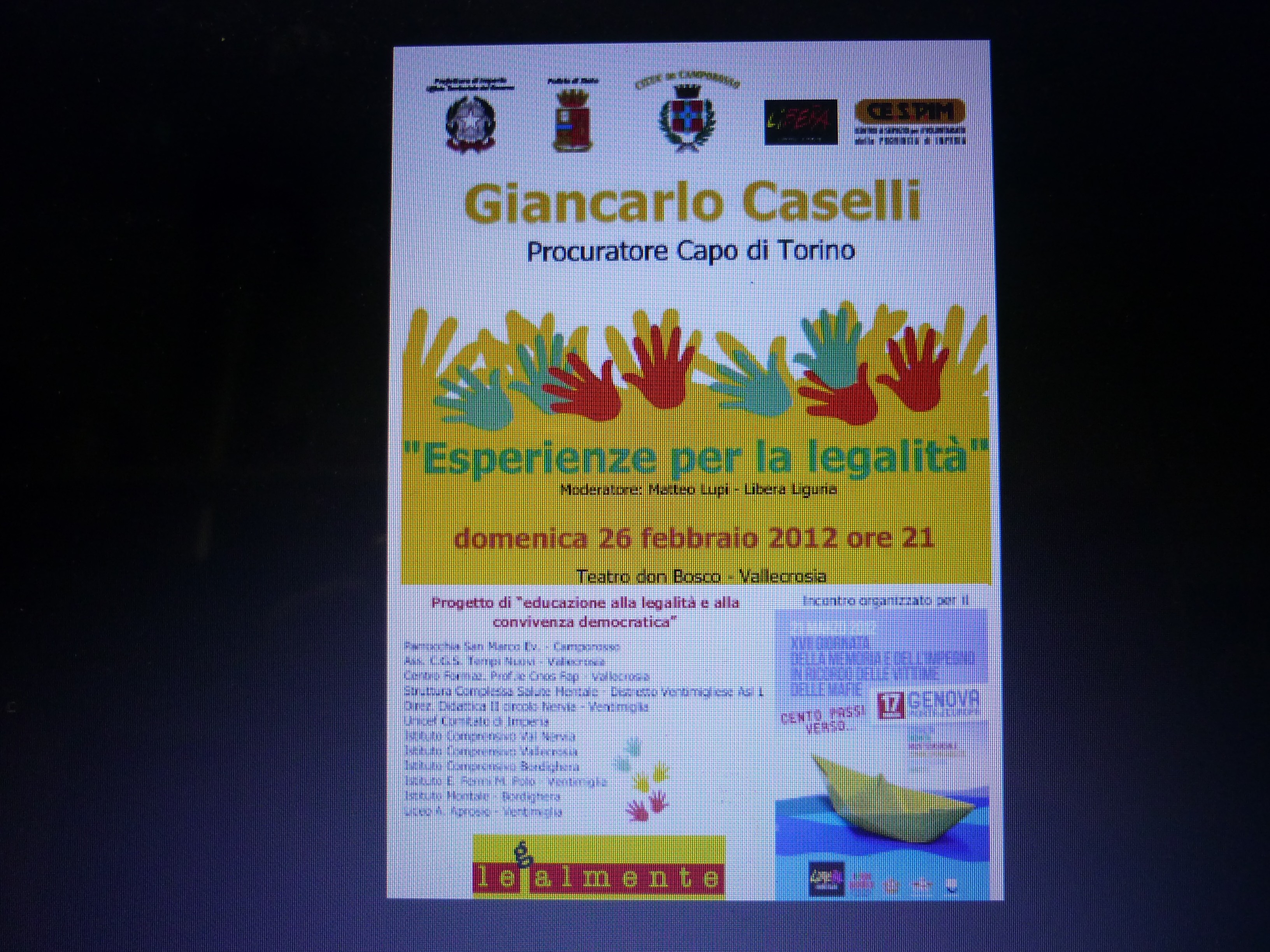La mattina di lunedì 27 febbraio, invece, Caselli incontrerà alcune classi delle scuole superiori di Ventimiglia al Liceo Aprosio di Ventimiglia. L’auditorium del Liceo potrà ospitare 200 ragazzi. I primi ad aderire sono state: le classi quarte del Liceo (100 ragazzi), il Cnos di Vallecrosia (20 ragazzi), alcune classi di terza media di Vallecrosia (30 ragazzi) e due classi terze dell’Istituto Fermi-Polo di Ventmiglia (50 ragazzi).