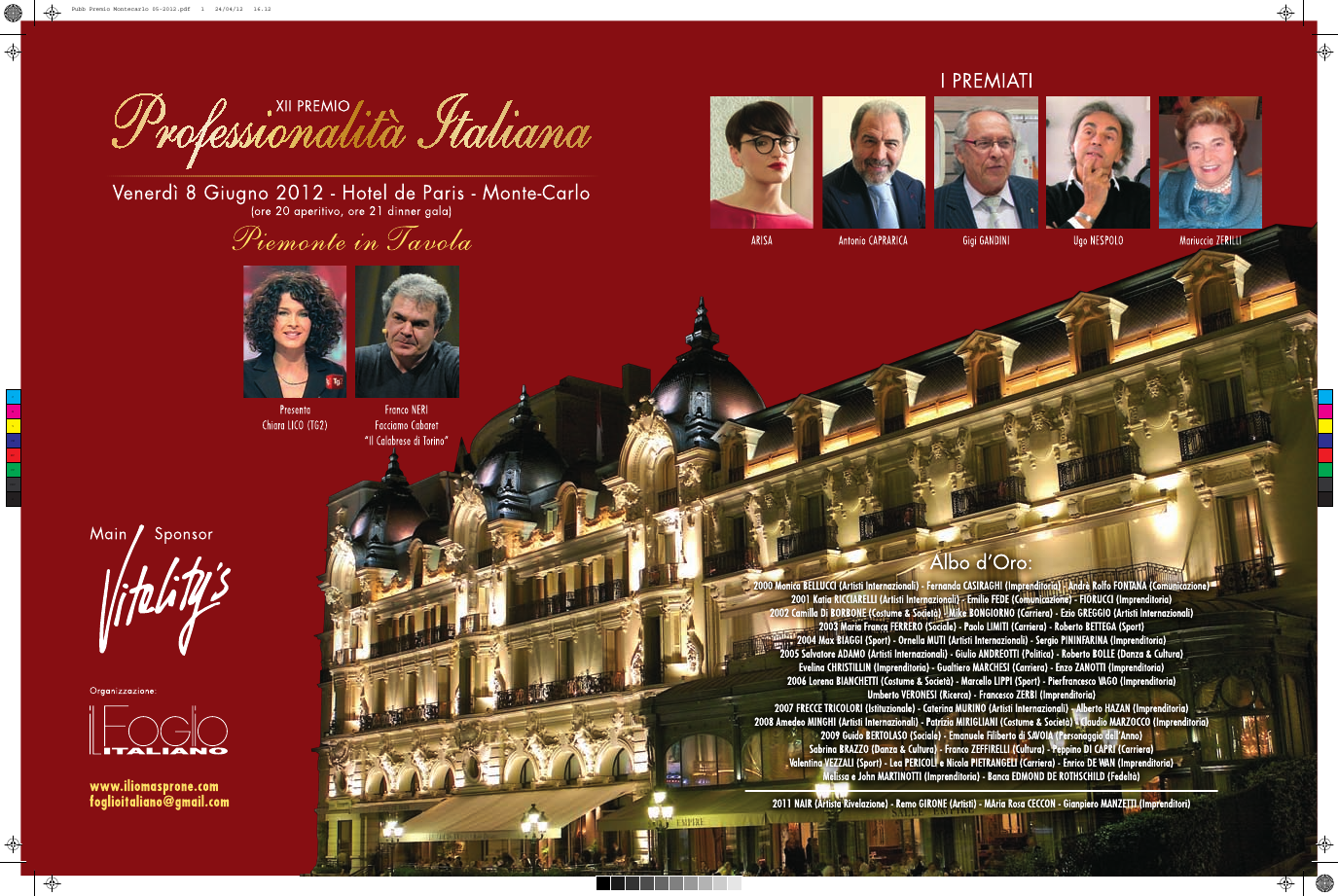 Montecarlo 26 aprile 2012, proseguono i preparativi  per il XII Premio “Professionalità Italiana”. L’evento è giunto alla 12^ edizione, ed e stato ideato  da Ilio Masprone. La serata di gala si svolgerà venerdì  8 giugno 2012 – Hotel de Paris – Montecarlo.