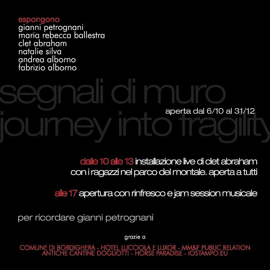 | L’Associazione Culturale  “Qui presenti” organizza l’evento  in ricordo di Gianni Petrognani “Segnali di muro” sabato 6 ottobre ,dalle ore 10,00 alle ore 13,00. All’evento  sarà presente Clet Abraham”sticker urban artist”  che vive a Firenze, sarà presente all’evento culturale  ” Segnali muro” presso l’Istituto Montale – via Cagliari- Bordighera. Il programma della giornata di domani: ore 10-13 Clet  con la sua idea sui cartelli stradali interagirà con gli alunni dell’Istituto, alle ore 17,00 ci sarà l’inaugurazione di una Mostra  in cui saranno esposte le opere di Clet e di Rebecca Ballestra ,Natalie Silva e di Gianni Petrognani, ex preside del Montale, scomparso recentemente . |