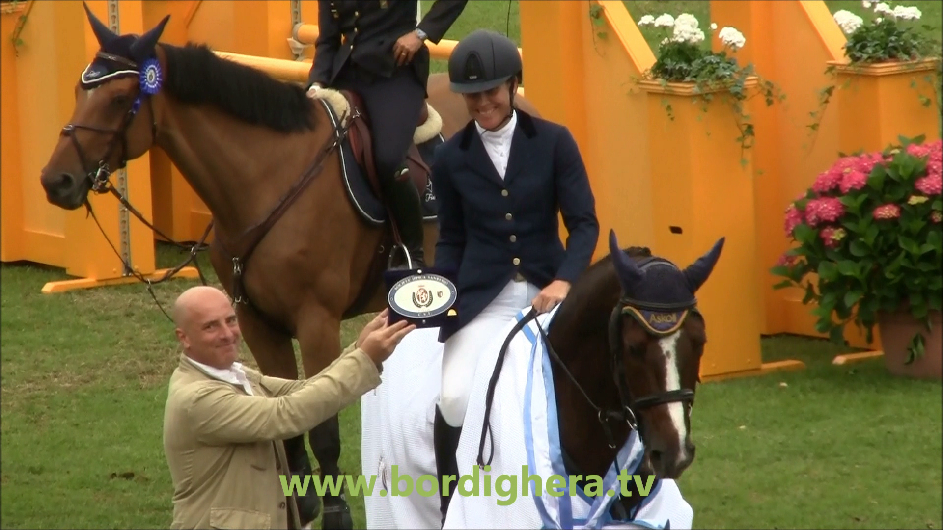 Sanremo 16 giugno 2013 , Campo ippico del Solaro- La giovane amazzone Alessia Marioni è la vincitrice del Gran Prix Internazionale di Sanremo, in sella  a Casanova Z risulta al comando della classifica che vede al secondo posto l’ucraino Szentirm Al Ferene  con Quickdiamond, al terzo posto lo svizzero fuoriclasse Daniel Etter con il suo Costanzia 3, al quarto posto Giulia Martinengo Marquet con Funke Van Theike, al quinto posto Calcus Laurent con Pop Star De Pia , al sesta posizione Montini Nicolò con Luky Du Reverdy.  Alla cerimonia di premiazione ha consegnato  le targhe l’assessore Gianni Berrino alla presenza della presidente della società Maria Grazia Valenzano Menada.