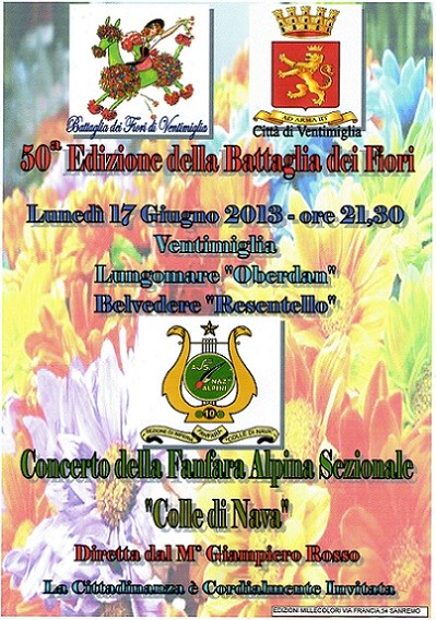 Questa sera, alle ore 21,30, al Belvedere “Resentello”, sulla passeggiata a mare “Oberdan” di Ventimiglia, si terrà l’atteso concerto della Fanfara Alpina Sezionale “Colle di Nava”.