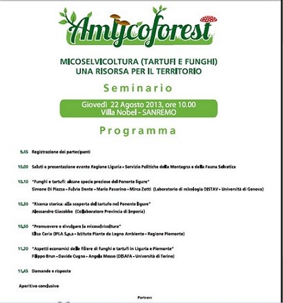 Sanremo, 22 agosto 2013 – E’ organizzato dalla Regione Liguria, nell’ambito del progetto ALCOTRA AMYCOFOREST, il seminario sui funghi e tartufi in programma per giovedi 22 agosto alle ore 10:00 presso la splendida cornice di Villa Nobel a Sanremo.