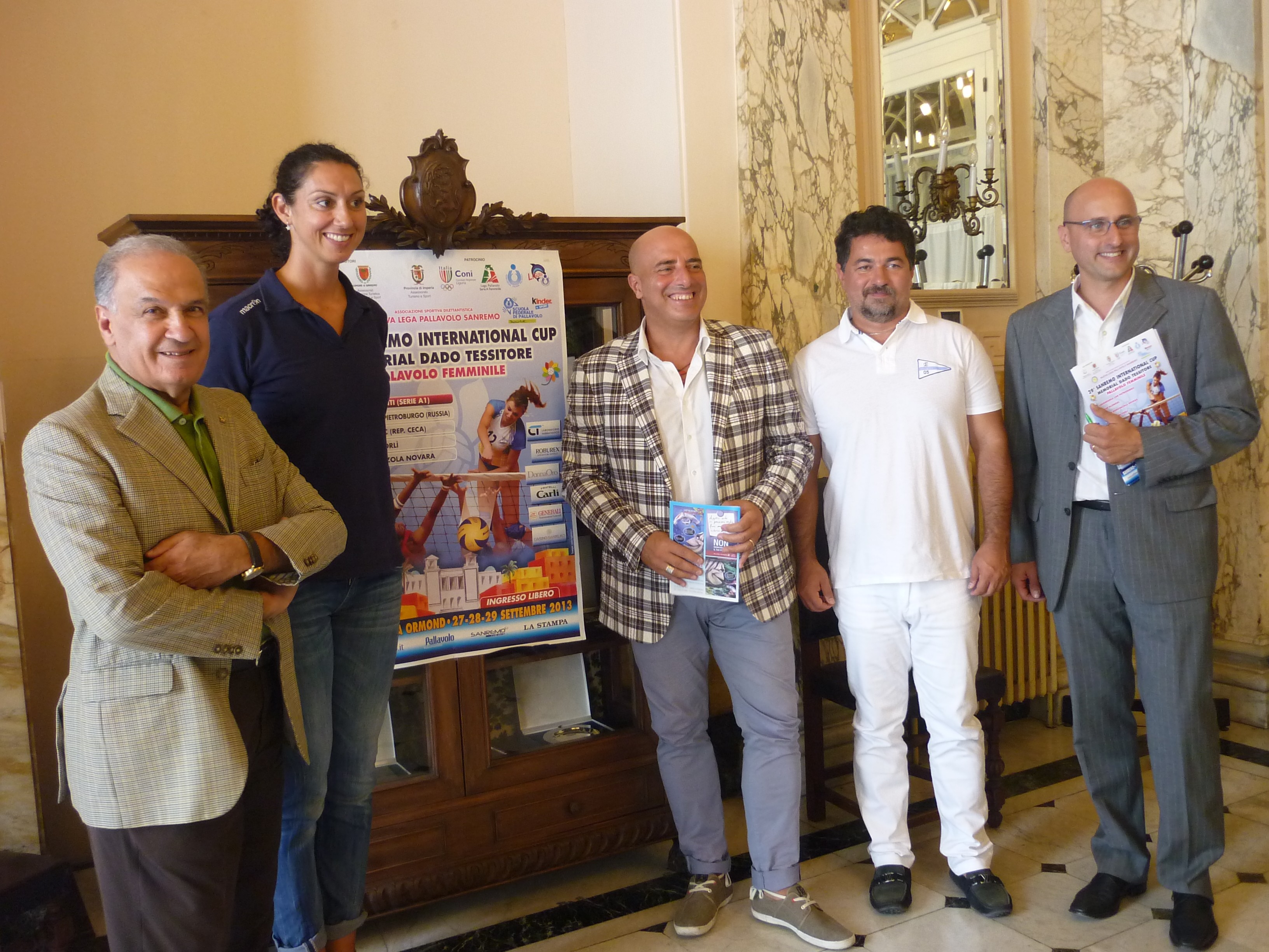 Gli organizzatori del 29° Sanremo International Cup Memorial Dado Tessitore (Pallavolo femminile).Enrico Chiavari presidente della Nuova Lega Pallavolo Sanremo, Carlo Ferraro direttore dell’evento, Gianni Berrino assessore comunale allo sport, hanno presentato martedì 24 settembre 2013 a Palazzo Bellevue l’evento del 29° Sanremo International Cup Memorial Dado Tessitore. Una new entry e tre graditi ritorni per la 29^ edizione del torneo internazionale di pallavolo femminile Sanremo Cup Memorial Dado Tessitore, quadrangolare di serie A1 in cartellone da venerdì 27 a domenica 29 settembre presso la tradizionale “bomboniera” di Villa Ormond.