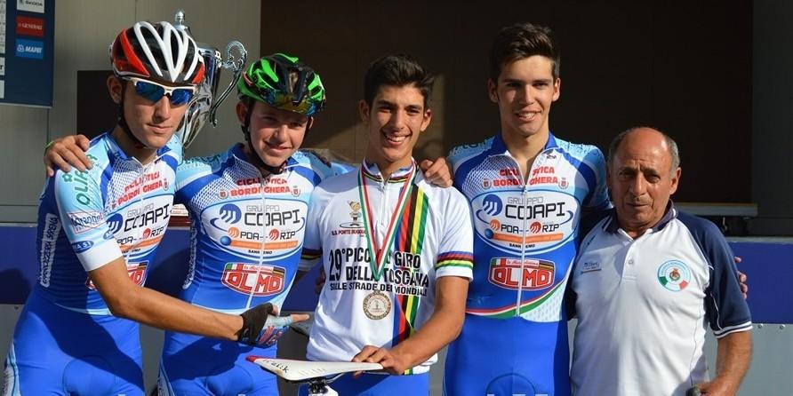 E nell’occasione l’organizzazione per il vincitore c’era la maglia dove venivano raffigurati i colori dell’iride del più forte del mondo. In questa occasione dopo aver conquistato l’Italia la Ciclistica Bordighera Olmo / Coapi conquista simbolicamente anche il mondo grazie al suo atleta Loris Calipa ottimo corridore al primo successo stagionale. Ma al di la’ delle sue caratteristiche atletiche il suo e’ stato un successo di qualità interpretativa della corsa, magistrale sul piano tattico riuscendo ad avere la meglio sui quotati compagni di fuga poi battuti in volata, non voleva come già successo parecchie volte quest’anno dove è stato protagonista di tanti chilometri di fuga e poi raccogliere poco e niente questa volta non ha voluto sbagliare a una quindicina di chilometri dall’ arrivo ci sono due atleti al comando e venivano raggiunti da Calipa e altri quattro atleti per formare così il plotoncino che si contende la vittoria, a poco meno di una decina di chilometri dal termine i fuggitivi in comune accordo procedono a ritmo regolare fino a quando Loris Calipa intravedeva la necessità di anticipare lo sprint, anche se stanco per un attacco fatto in precedenza. Così il nostro corridore al secondo tentativo centrava il bersaglio ed aveva il tempo di rialzarsi ed esultare per la vittoria. Il Direttore sportivo Guerino Lanzo in questo mese di settembre tra Trentino, Piemonte e Toscana ha fatto riflettere sul mondo del ciclismo una vera realtà della pur piccola società sportiva che con impegno e sacrificio da parte dei ragazzi ma ancor di più da questa DS che si prodiga per migliorarsi ogni giorno e con molta umiltà non vuole sottovalutare il clima che solo bordighera e l’estremo ponente può avvalersi per potersi allenare con continuità tutto l’anno.