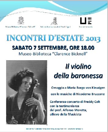 Sabato 7 settembre alle ore 18 si terrà a Bordighera presso la prestigiosa cornice del Museo-Biblioteca “Clarence Bicknell” un incontro culturale dedicato al ricordo di una celebrità locale: con il titolo “Il violino della Baronessa” si vuole infatti omaggiare la musicista Maria Borgo von Kleudgen, valente violinista vissuta nel secolo scorso. Nel salone del Museo il ricordo dell’artista bordigotta sarà tessuto dal ricercatore musicale Freddy Colt, nel corso di una conferenza-concerto in cui verrà tracciata la personalità artistica e le vicende culturali del Ponente ligure dei primi decenni del Novecento. In particolare la figura di Maria Borgo sarà messa in relazione con quella del suo maestro, il grande didatta Francesco Sfilio (1876-1973), fondatore della “Nuova Scuola Violinistica Italiana” e residente a Sanremo. Altro legame importante quello con la nobile famiglia dei Von Kleudgen, avendo la violinista sposato il figlio del celebre pittore attivo a Bordighera, anche se resterà prematuramente vedova. A rendere una testimonianza sulla baronessa Maria Borgo von Kleudgen sarà l’allievo musicista Alfonso Moretta, professore di violino in diverse scuole della provincia e neo-presidente dell’Orchestra Giovanile del Ponente Ligure.
