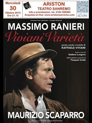 Mercoledì 30 ottobre 2013, alle ore 21,15 al Teatro Ariston Sanremo, Coomedia in Musica con Massimo Ranieri in “VIVIANI VARIETA’ “ , poesie, parole e musiche di Raffaele Viviani , la regia è a cura di Maurizio Scaparro. Lo spettacolo ripercorre la vicenda di un viaggio (1929) su un piroscafo Duilio da Napoli a Buenos Aires fatto da Viviani con la sua compagnia. Le prove destinate agli emigranti italiani alla ricerca di un futuro migliore nell’America del Sud. Oltre che il divertimento questo varietà si può riallacciare alle tematiche di oggi , agli interrogativi ed alle incognite sul nostro futuro.