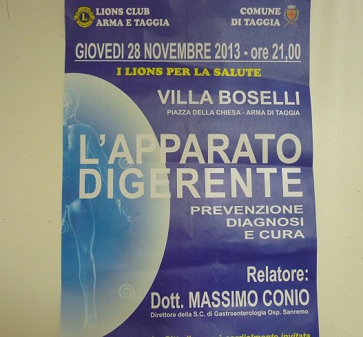 Giovedì 28 novembre ore 21,00 ad Arma di Taggia presso Villa Boselli (Piazza della Chiesa) inizierà un interessante ciclo di conferenze dal titolo “I Lions per la salute”. Gli incontri sono organizzati dal Lions Club Arma e Taggia con il patrocinio del Comune di Taggia e verteranno su temi fondamentali per la salute: prevenzione, diagnosi e cura.