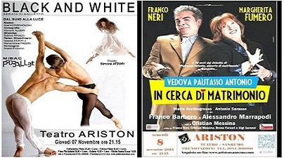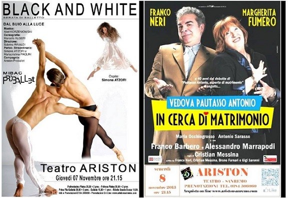 .- venerdì 8 novembre alle ore 21.15 Franco Neri e MargheritaFumero presentano la commedia in due atti “VedovaPautasso Antonio in cerca di matrimonio”———————————————–SIMONA ATZORI, MARCELLO ALGERI E SABRINA RINALDI PRESENTANO:”BLACK AND WHITE”“Dal Buio alla Luce”Un progetto Ariston Proballet di Marcello Algeri e Sabrina Rinaldi con laPartecipazione straordinaria della Danzatrice e Artista Simona Atzori.Il progetto si colloca nel progetto mondiale DANCE FOR CHANGEIl balletto “DAL BUIO ALLA LUCE” è un cammino di pura energia.Black and White è un balletto dove i danzatori cercano di uscire dal buio e arrivare alla luce ma,nel loro intento di raggiungere la perfezione, soccombono spesse volte a causa delle varie sfaccettature della psiche umana come l’ambizione, la seduzione, la nascita, la morte e deglieventi. Questo balletto è un viaggio per uscire dal buio verso la libertà finale