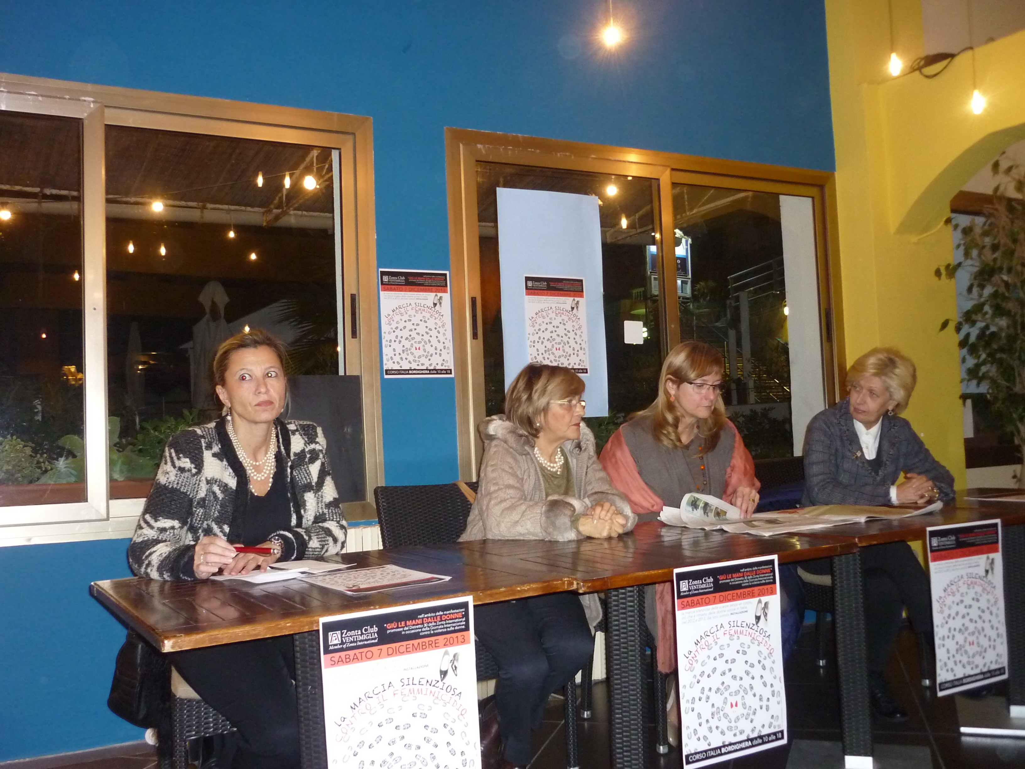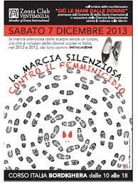 La presidente dell’Associazione “Zonta Club” di Ventimiglia Laura Tibald ha presentato presso il ristorante “Amarea” l’evento che il Club sta organizzando per il giorno 07 dicembre 2013. Si tratta di una “Marcia Silenziosa contro il femminicidio” che avrà luogo in Corso Italia a Bordighera dalle ore 10,00 alle ore 18,00.Per” femminicidio” s’intende uccisione di una donna da parte di un uomo che ha legami sentimentali con la vittima, mariti, compagni o fidanzati. -L’evento rientra nell’ambito delle manifestazioni” GIU’ LE MANI DALLE DONNE” promosse dal Distretto 30 dello Zonta International in occasione della Giornata Internazionale contro la violenza sulle donne. SABATO 7 DICEMBRE 2013- la marcia silenziosa delle scarpe senza un corpo, ciò che è rimasto delle donne uccise in Italia, nel 2012 e 2013, dai loro uomini. Alla conferenza ha partecipato Luisella Berrino, giornalista e nota “voce” di Radio-Montecarlo.