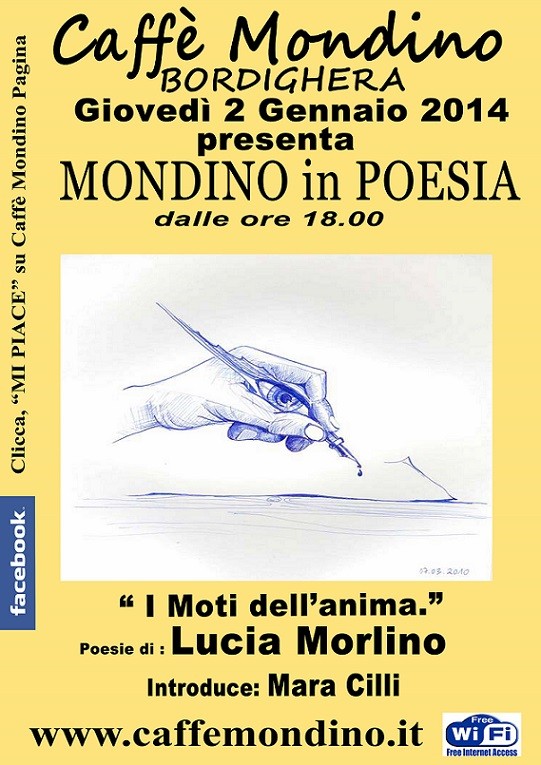 Bordighera News “I Moti dell’anima” un libro di Lucia Morlino 2 Gennaio 20143 Gennaio 2014 admin Bordighera 02 gennaio 2014, ore 18,00  presso il Caffè Mondino di Bordighera presentazione del libro “I Moti dell’anima” di Lucia Morlino. Introduce: Mara Cilli Nino Collu .