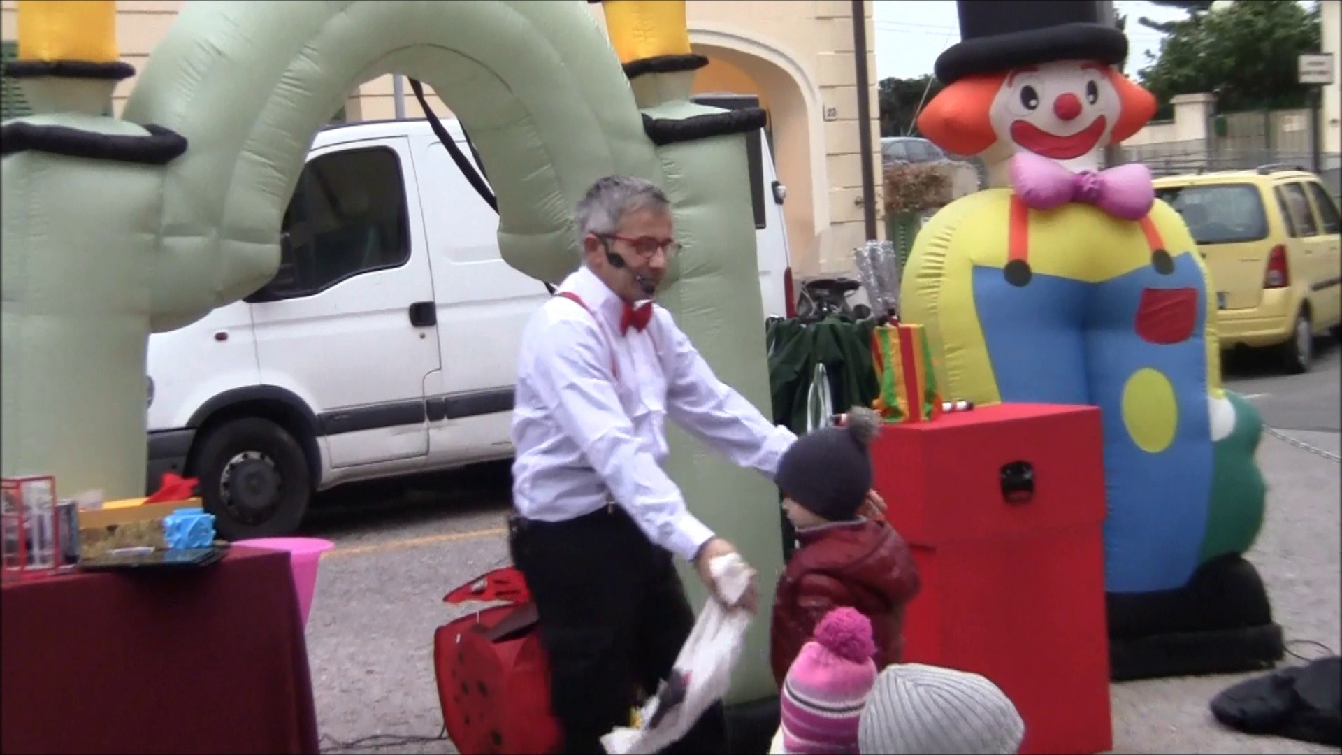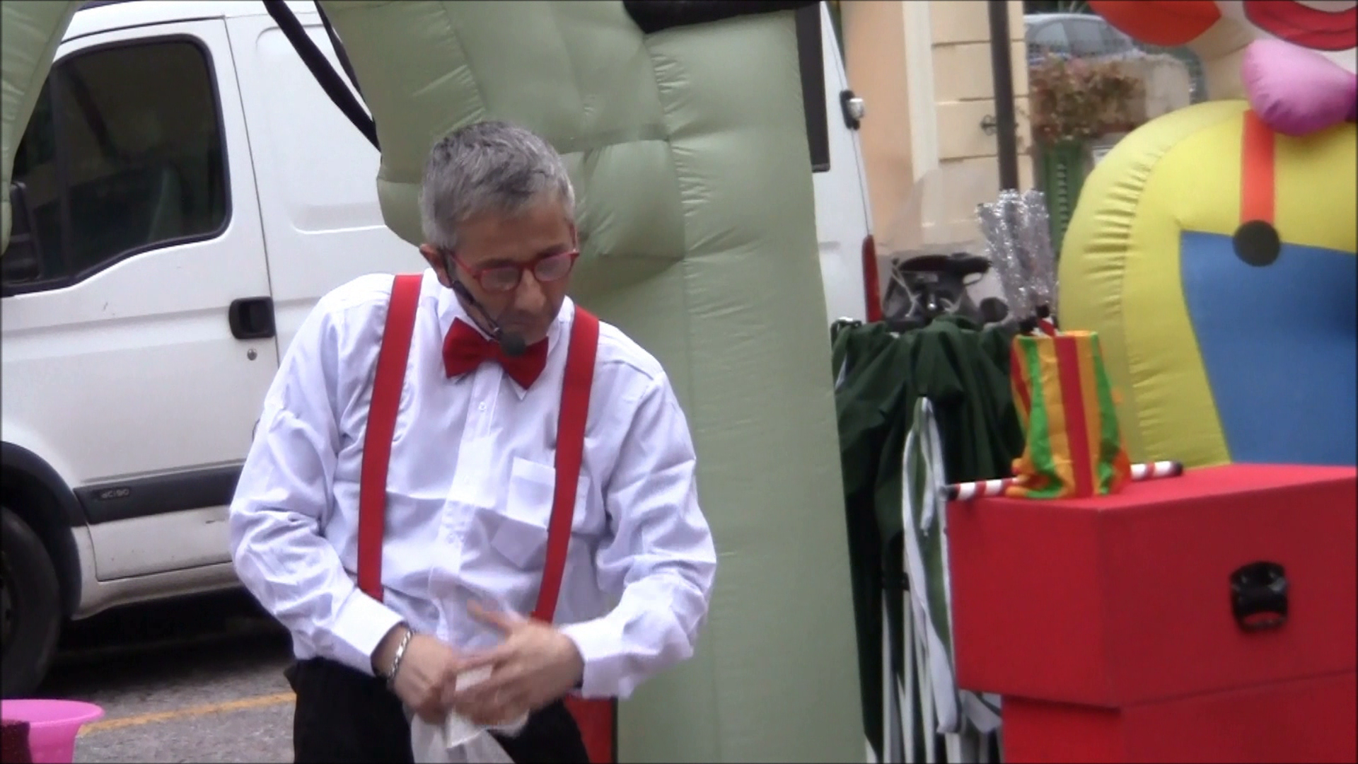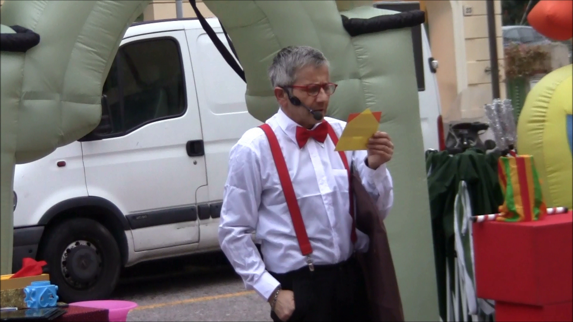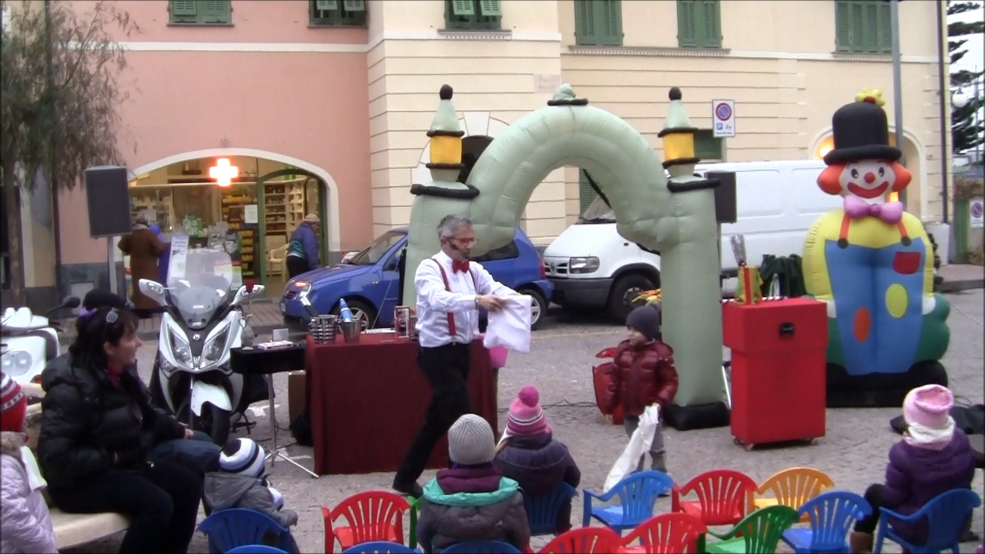 Bordighera 01 gennaio 2013-in Piazza Mazzini- il Teatro dei Mille Colori con Salvatore Stella ha presentato uno spettacolo dedicato ai bimbi , la scenografia creata con pupazzi gonfiabili,  giochi di prestigio, foulards e oggetti  dai mille colori è subito piaciuta ai piccoli spettatori, tutti molto attenti alle parole del “Personaggio Cantastorie”  e pronti a partecipare ai giochi. Ma il tempo ,in questi giorni poco stabile, ha fatto interrompere per la pioggia lo spettacolo. E in breve tutti si sono allontanati, con la speranza di rivedere il ” Personaggio Cantastorie” in un’altra  data, che sarà il giorno 5 gennaio in occasione della tradizionale ” Befana Bordigotta”.