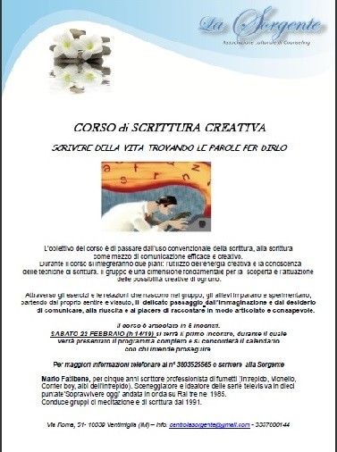SABATO 22 Febbraio 2014. LO SCOPO DEL CORSO E’ QUELLO DI LIBERARE LA CREATIVITA’ NASCOSTA IN OGNUNO DI NOI. LA CREATIVITA’ E’ LA FORZA DELLA NOSTRA STESSA VITA CHE, SOVENTE, NON OSIAMO ESPRIMERE E SENTIRE.