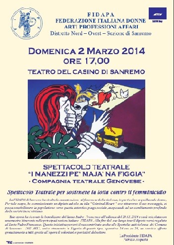 News Sanremo SANREMO “I MANEZZI PE’ MAJA’ NA FIGGIA” AL TEATRO DEL CASINO’ 28 Febbraio 201428 Febbraio 2014 admin Domenica 2 marzo 2014 ore 17.00 al Teatro del Casinò di Sanremo “I manezzi pe majà na figgia”, organizzazione a cura della Fidapa  e il patrocinio del Comune di Sanremo nell’ambito del progetto “Criminal heart”. N. Collu