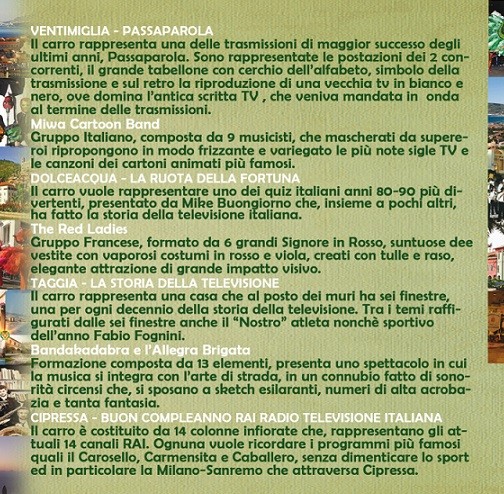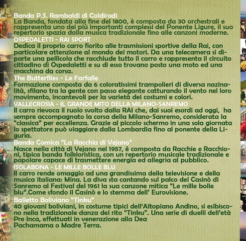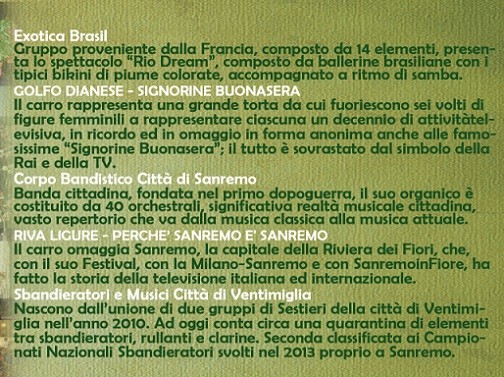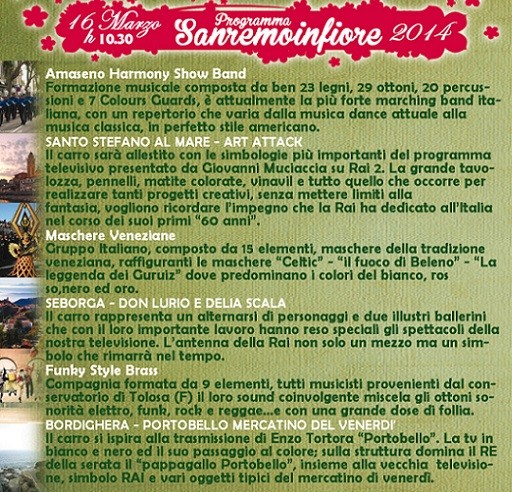 Sanremo SANREMO in FIORE 2014 “SFILATA DEI CARRI” 11 Marzo 201417 Marzo 2014 admin Si comunica che l’orario di inizio della manifestazione in oggetto è le 10.30. In al