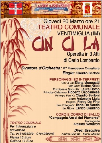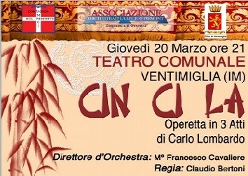 Altre Città VENTIMIGLIA – OPERETTA “CIN CI LA” 19 Marzo 201425 Marzo 2014 admin Teatro Comunale di Ventimiglia GIOVEDI’ 20 MARZO ore 21 CIN CI LA Operetta in tre atti con la Compagnia di Operette Orchestra d’la Region Piemont