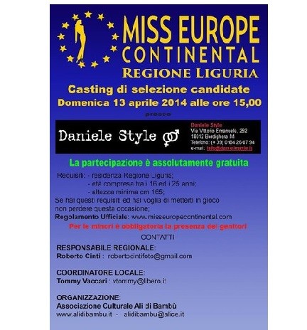 Bordighera 01 aprile 2014 –  Una notizia di interesse per le giovani e belle ragazze ( età 16-25 anni) che vorranno partecipare ad un evento  importante che si svolgerà nella nostra città : il Casting di selezione candidate per MISS EUROPE CONTINENTAL ( REGIONE LIGURIA) nel giorno del 13 aprile 2014 dalle ore 15:00 presso ” Daniele Style” via Vittorio Emanuele 292. La partecipazione è gratuita.( la redazione).