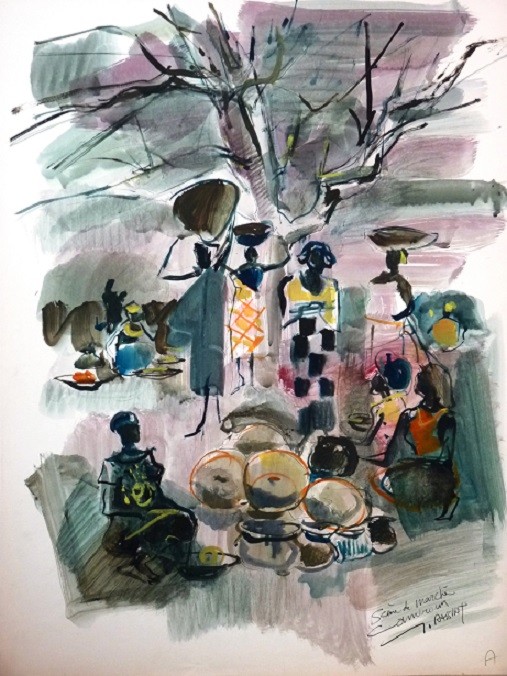 Cameroun, Scène de marché, 1970 , gouache sur papier, 65x50cm