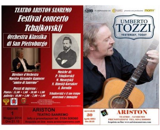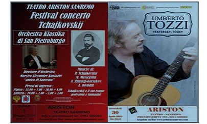 Teatro Ariston Sanremo Doppio appuntamento al Teatro Ariston in occasione del ponte del primo maggio:- Mercoledì 30 aprile alle 21.15 Umberto Tozzi con il nuovo Tour teatrale YESTERDAY ….TODAY Ieri e oggi. Con 70 milioni di copie di dischi vendute, Umberto Tozzi è uno dei più famosi cantautori italiani nel mondo, e torna con un tour nei teatri più importanti d’Italia, location ideali per la sua musica melodica e raffinata, a due anni dall’uscita mondiale del suo nuovo album intitolato Yesterday … Today (10 brani inediti con testi e musiche di Umberto Tozzi eun secondo cd con i 17 singoli più importanti della sua carriera completamente rivisitati e riarrangiati). Umberto canterà i suoi più grandi successi con la sua fidata band in un magnifico concerto che spazia dai primi anni 70 (con tutti i grandi successi da Gloria, NotteRosa, Si puo’ dare di piu’, Ti Amo, Gli altri siamo noi, Immensamente) fino ai giorni nostri.