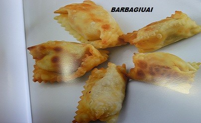 BARBAGIUAI: bollire i fagioli, asciugare la zucca in forno, tritarla e strizzarla con uno strofinaccio, metterla in una ciotola e aggiungere i fagioli, il riso – già precedentemente lessato al dente- le uova , il sale, la maggiorana, il peperoncino, il parmigiano e il pecorino. Amalgamare bene il composto, impastare la farina con un po’ di olio d’oliva, l’acqua , il sale. Stendere la pasta dello spessore di 2 millimetri e tagliarla con la rotella dentata in piccoli rettangoli. Disporre al centro dei rettangoli di pasta un po’di ripieno e chiuderli, pressando sui bordi. Friggere in oliod’oliva bollente e servire ben caldi.