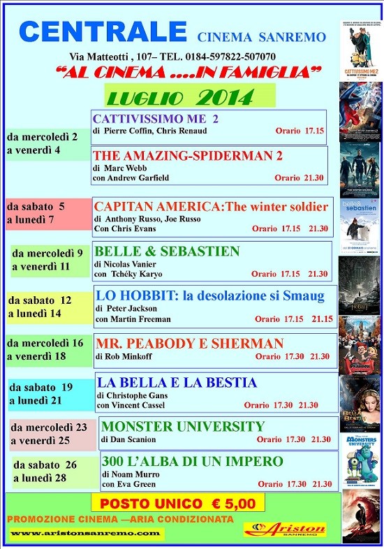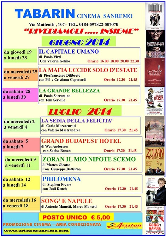 L’Ariston srl comunica che per la stagione Estiva 2014 promuove due rassegne cinematografiche dal titolo “Rivediamoli insieme “ e Al Cinema In Famiglia” rispettivamente al Cinema Tabarin e al Cinema Centrale , la prima è iniziata il 19 giugno 2014 al Tabarin per concludersi oltre la metà di agosto , la seconda inizierà i primi di luglio ed anch’essa si concluderà oltre la metà di agosto
