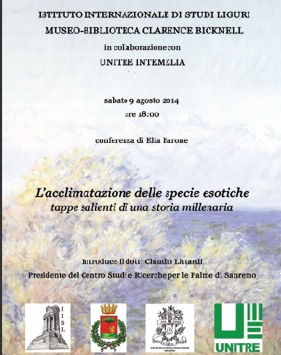 Sabato 9 agosto 2014 ore 18:00 al Museo Clarence Bicknell a Bordighera avrà luogo la conferenza di Elia Barone su ” L’acclimatazione delle Specie esotiche : Tappe salienti di una storia millenaria”. L’introduzione sarà a cura del dott. Claudio Littardi, presidente del Centro Studi e ricerche per le Palme di Sanremo: