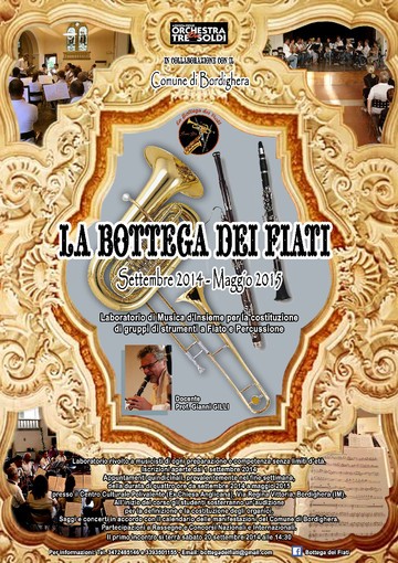 Sabato 20 settembre alle ore 14.30 al via la seconda edizione del Laboratorio di Musica d’Insieme per Fiati e Percussioni “La Bottega dei Fiati”. Si rivolge ai musicisti di tutte le età che avranno l’opportunità di approfondire le conoscenze musicali ed esecutive attraverso il lavoro d’insieme a cura del prof. Gianni Gilli, primo clarinetto dell’Orchestra Sinfonica di Sanremo. A inizio corso è prevista un’audizione per la definizione e la costituzione degli organici. Appuntamenti quindicinali, prevalentemente nel fine settimana, della durata di quattro ore da settembre 2014 a maggio 2015 presso il centro culturale polivalente (ex chiesa anglicana), via Regina Vittoria, Bordighera (IM).