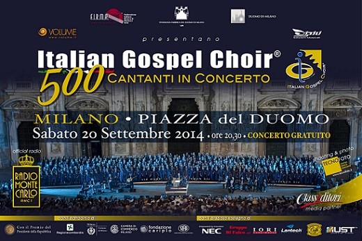 Sarà una serata unica, straordinaria ed emozionante quella che si terrà sabato 20 settembre 2014, alle ore 20.30, in Piazza del Duomoa Milano grazie al concerto dell’Italian Gospel Choir, il coro che rappresenta l’Italia in questo genere musicale. Per l’occasione la Nazionale disporrà sul prezioso Sagrato della Cattedrale meneghina, nientemeno che 500 coristi provenienti da tutto il Paese. L’appuntamento, introdotto dall’inconfondibile voce di Radio Monte Carlo Nick The Nightfly, sarà interamente dedicato alle famiglie che, tra musica e Fede, vedranno il fulcro della metropoli lombarda tingersi di “Blu”. Questa originale idea nasce dalla collaborazione tra l’associazione f.i.r.m.a. – Federazione Italiana Ricerca di Musica e Arte, la Veneranda Fabbrica del Duomo di Milano e laChiesa Cattedrale di Milano. Ed è proprio la f.i.r.m.a., guidata dall’eclettico cantante e musicista Francesco Zarbano, a portare in seno la gestione del blasonato coro che, lo ricordiamo, si esibì per la prima volta in Piazza Duomo nel 2011, con una formazione numericamente consistente che ottenne un inatteso successo di pubblico. Per questa edizione sono davvero tante le novità che si troveranno di fronte gli spettatori che seguiranno dalla piazza il concerto, a partire dalle performance canore dei veri protagonisti della serata: 500 cantanti che si cimenteranno, con tutta la loro potenza, in un repertorio totalmente nuovo e dai ritmi coinvolgenti. I“Singers” saranno guidati dal talentuoso Maestro Alessandro Pozzetto che, oltre ad essere Direttore dell’Italian Gospel Choir, è anche un raffinato musicista e cantante dalle tecniche vocali degne del miglior “Gospel Man” americano.