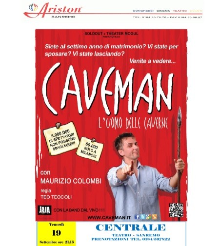 L’UOMO DELLE CAVERNE di Rob Becker regia di Teo Teocoli Caveman, il monologo più famoso al mondo dedicato al rapporto uomo-donna. Caveman con Maurizio Colombi per la regia di Teo Teocoli è arrivato in Italia nel 2008 e grazie al passaparola è diventato un culto per decine di migliaia di spettatori che lo hanno visto, lo hanno consigliato agli amici, ci hanno accompagnato il proprio partner. Il testo originale, scritto da Rob Becker, è frutto di tre anni di studi di antropologia, psicologia, sociologia, preistoria e mitologia, ed è stato portato per la prima volta sul palco nel 1995 allo Helen Hayes Theatre di New York,diventando il monologo più longevo nella storia di Broadway.Nel 2000 Caveman è vincitore del Premio Laurence Olivier come miglior spettacolo d’intrattenimento.La versione italiana è interpretata da un sorprendente Maurizio Colombi, conosciuto anche come regista di vari musical e spettacoli teatrali di grande successo (Peter Pan, We Will Rock You, La Divina Commedia, Heidi, Io Odio i Talent Show, Christmas Show, I Gormiti…), che in questo monologo si esibisce rivelandosi un attore comico irresistibile.Caveman continua a riscuotere un successo dietro l’altro diffondendosi a macchia d’olio, come un vero e proprio fenomeno. Basti pensare che lo hanno già visto da 4.000.000 di coppie in tutto il mondo e solo a Milano da oltre 50.000 spettatori negli ultimi 4 anni. A fine serata il pubblico ha a disposizione delle cartoline umoristiche firmate Caveman, un modo divertente per spedire un pensiero e commentare liberamente lo spettacolo.L’eterno incontro/scontro tra uomo e donna, le manie, i difetti, i differenti modi di pensare e agire.Un tema vecchio come il mondo. Caveman vi farà ridere, vi aiuterà a capirvi e ad essere più felici insieme.“La lotta tra i sessi dalla preistoria ad oggi”Uomo e donna sono così diversi? Maurizio Colombi e Caveman vi guidano alla scoperta delle differenze tra uomo e donna in modo ironico e divertente, mai volgare.Il pubblico ride, si diverte e si riconosce nelle situazioni descritte di vita quotidiana.Sei innamorato? Cerchi l’amore della tua vita?Sei stata lasciata? Non capisci il tuo fidanzato?Ti stai per sposare? Caveman è adatto a tutti. Caveman è molto seguito anche da corsi pre-matrimoniali! Caveman è lo spettacolo di maggior successo al mondo sul rapporto di coppia!Vi aiuterà a capire il vostro partner e ad essere più felici insieme.(“lo spettacolo è strepitoso.. non si può perdere!” Mario Luzzato fegiz. Dal Corriere della sera)