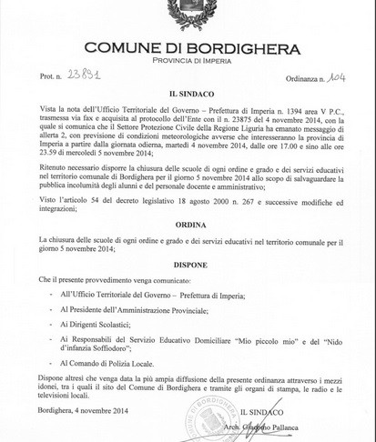 Bordighera BORDIGHERA “5 NOVEMBRE CHIUSURA SCUOLE DI OGNI ORDINE E GRADO 4 Novembre 20144 Novembre 2014 admin ORDINANZA DEL COMUNE DI BORDIGHERA Ordinanza di chiusura delle scuole di ogni ordine e grado e dei servizi educativi presenti nel territorio comunale, prevista per domani mercoledì 5 novembre 2014. La redazione