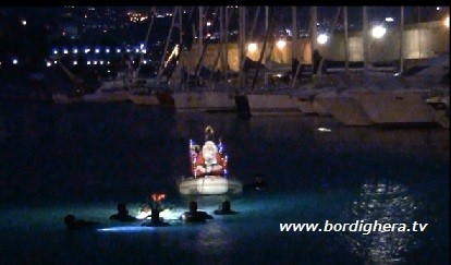 Anche quest’anno, al Porto Turistico di Bordighera, Babbo Natale è arrivato dal Mare a bordo di un gommone trainato da sommozzatori. L’organizzazione dell’evento è del Centro Sub Riviera. Una grande Festa rivolta a tutti i bimbi che ogni anno festeggiano l’arrivo di Babbo Natale.