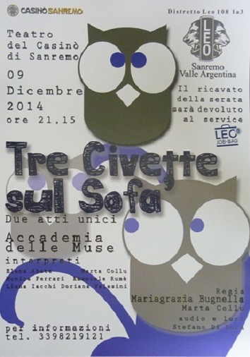 Ambaraba’ Cicci’ Cocco’ tre civette sul sofà ...l’Accademia delle Muse di Bordighera presenta due atti unici che raccontano con ironia e comicità quanto sia complessa la convivenza delle “tre civette” sotto lo stesso tetto. Protagonisti sono i legami familiari e la loro difficoltà da cui nasce un alternarsi di divertenti momenti di conflittualità e di complicità .