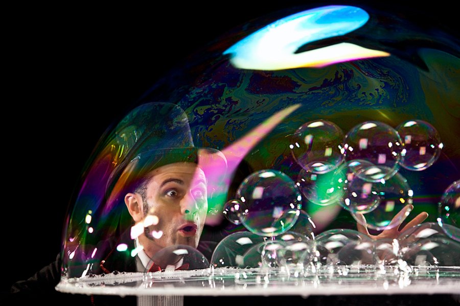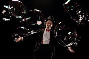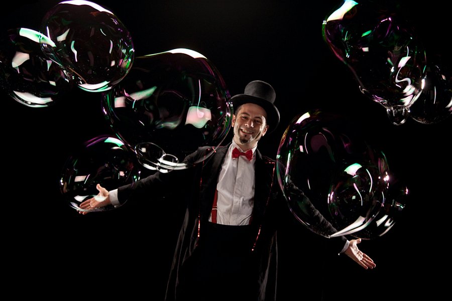 Dopo lo spettacolo “Ouverture des Saponettes” un concerto per bolle di sapone, Michele Cafaggi ritorna a sperimentare attrezzi, materiali e tecniche per trovare nuove forme espressive attraverso l’utilizzo di BOLLE DI SAPONE giganti.