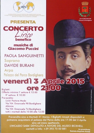 CONCERTO – Lirico – benefico con musiche di Giacomo Puccini nella serata di venerdì 3 aprile 2015 alle ore 21.00 al Palazzo del Parco di Bordighera