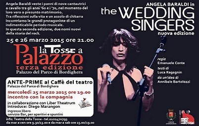 ANTE-PRIME al Caffè del teatro. Tornano gli eventi teatrali de “La Tosse a Palazzo” a Bordighera nell’ambito della stagione teatrale invernale patrocinata dal Comune e assieme a loro anche la possibilità di conoscere e incontrare dal vivo registi e attori degli spettacoli messi in scena al Palazzo del Parco, grazie all’iniziativa congiunta con l’Associazione Culturale “LIBER theatrum” e Diego Marangon che condurrà, come al solito le “ANTE-PRIME. L’ appuntamento fissato per mercoledì 25 marzo alle ore 19.00 : ospiti saranno il regista Emanuele CONTE e la protagonista dello spettacolo Angela BARALDI a pochissime ore dalla messa-in- scena fissata per le ore 21.00 di “THE WEDDING SINGERS.” Angela Baraldi cantante ed attrice, nota come protagonista del film “Quo vadis baby” per la regia di Gabriele Salvatores, vestirà i panni di nove cantautrici nel momento del loro vero o presunto matrimonio mentre si trovano dinnanzi all’altare, in attesa dello sposo. Tra riflessioni sulla vita e un assolo di chitarra si incontreranno le grandi protagoniste di un indimenticabile periodo musicale.Uno spettacolo originale e intenso in cui la voce di Angela, accompagnata dalla sua band formata da tre musicisti, ripercorrerà la musica americana al femminile, raccontando gli splendori della vita pubblica di nove artiste, gli applausi, gli eccessi e i trionfi, nel contempo le intime delusioni della loro vita privata. Da Janis Joplin a Nina Simone, passando per Nicolette Larson e Bessie Smth, la grande regina del blues. Nove cantanti, ma soprattutto nove donne: il bilancio delle loro esistenze travagliate, da ribelli e sofferte con la musica faranno da filo conduttore. Lo spettacolo sarà replicato giovedì 26 marzo.