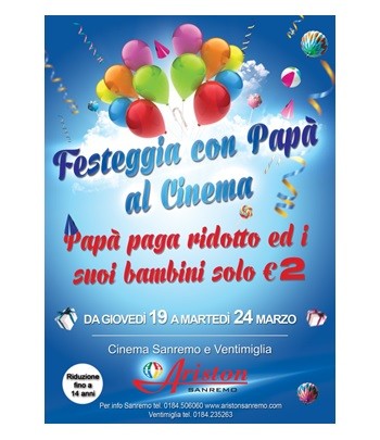 Altre Città Cinema FESTEGGIAMO IL PAPA’ – CINEMA SANREMO E VENTIMIGLIA 16 Marzo 201525 Marzo 2015 admin Festeggiamo il papa’ Da giovedì 19 a martedì 24 marzo 2015 la Società Ariston S.r.l.  offre nelle sale cinema di Sanremo e Ventimiglia la possibilità di pagare biglietti d’ingresso ridotti ai papà , e i suoi bambini pagano solo euro 2,00.