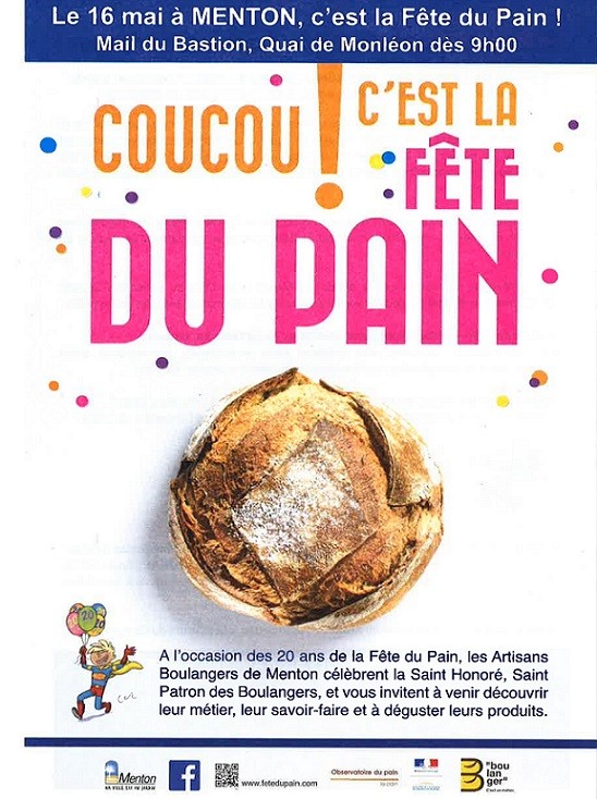 La Fête du Pain célèbrera ses 20 ans lors de son édition 2015 qui se déroulera le samedi 16 mai. Ainsi, les Artisans Boulangers mentonnais fêteront la Saint Honoré en invitant le public à découvrir leur métier et leurs produits, lors d’une journée festive sur le mail du Bastion.