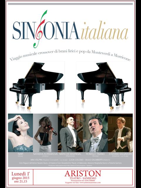 Sinfonia Italiana è un progetto musicale “crossover” che percorre il mondo della musica classica, lirica, pop e della danza: una sorta di viaggio-reality musicale che parte da Domenico Scarlatti a Nicola Piovani. Dopo il successo della Prova Generale al Teatro Sociale di Biella dell’anno scorso, lo spettacolo debutta a Sanremo con una versione speciale per Solisti e Due Pianoforti.