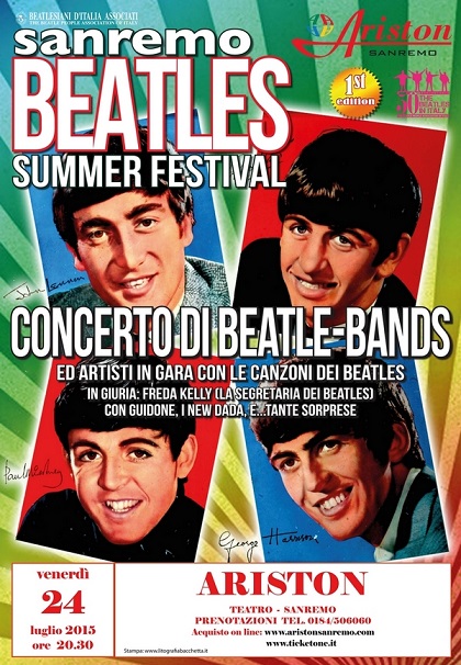 La prima attesa edizione, del SANREMO BEATLES’ SUMMER FESTIVAL si terrà a Sanremo al Teatro Ariston, venerdì 24 luglio dalle 20.30, a cura di Beatlesiani d’Italia Associati, in collaborazione con il Teatro Ariston ed il Patrocinio del Comune di Sanremo, nel pieno dell’Estate Sanremese, non in contrapposizione con il Festival di Sanremo che si tiene in inverno, ma in assoluta sinergia per il fortissimo legame artistico e musicale che li lega! Tutti ricordano, infatti, che sul mitico palco dell’Ariston si esibì anche Paul McCartney nel 1988 e George Harrison partecipò al Festival di Sanremo presentando “When We Was Fab”…