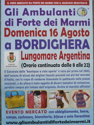 Un diffuso malcontento dei commercianti ambulanti di Bordighera nei confronti dell’Amministrazione,  per l’autorizzazione rilasciata al  Consorzio delle “boutiques a cielo aperto” di Forte dei Marmi  per la giornata di Domenica 16 agosto sul Lungomare Argentina di Bordighera.