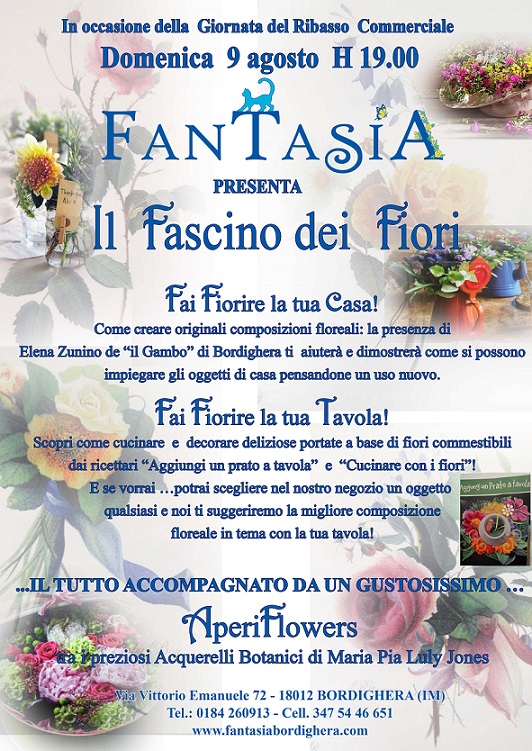 Alle ore 19,00 seguirà un evento: il fascino dei fiori a cui  parteciperà la  fiorista Elena Zunino, che  confezionerà piccoli centrotavola e  composizioni floreali,  ci saranno anche  due acquerelli botanici di Maria Pia Luly Jones.  Una  signora presenterà ricette a base fiori commestibili quindi si potranno acquistare petali di fiori commestibili per cucinare e ricettari in cui si potrà imparare a cucinare e a decorare con i fiori.